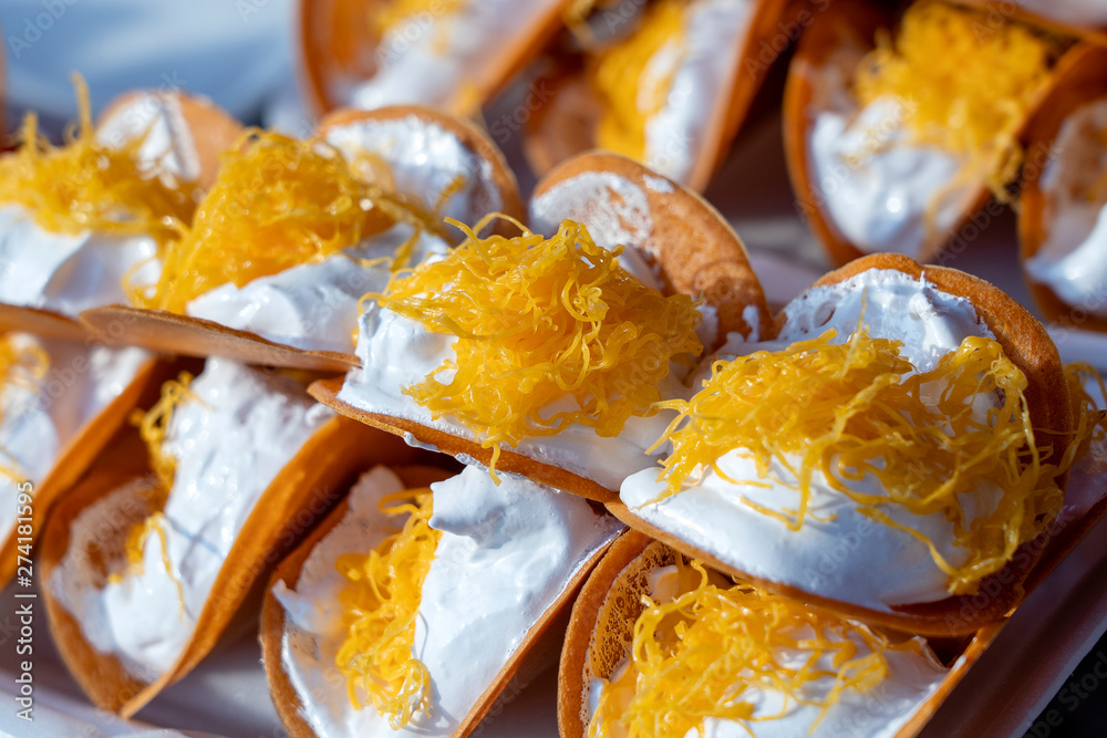 Kanom Bueang are essentially bite-sized Thai-style crepes. The ‘pancake’ follows more closely to a thin wafer, made from rice flour before it is stuffed with coconut cream and shreds of coconut flesh. The stuffing also varies to include egg yolks or chopped scallions.
